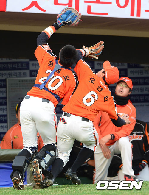 30일 오후 부산 사직구장에서 열린 '2013 한국야쿠르트 세븐 프로야구' 롯데 자이언츠와 한화 이글스의 경기 7회말 1사 3루 강민호의 파울타구를 정범모와 오선진이 잡으려다 충돌하고 있다.