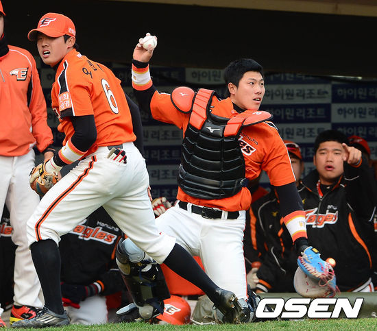 30일 오후 부산 사직구장에서 열린 '2013 한국야쿠르트 세븐 프로야구' 롯데 자이언츠와 한화 이글스의 경기 7회말 1사 3루 정범모가 강민호의 뜬공을 잡고 있다.