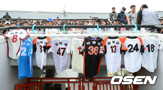 30일 오후 부산 사직구장에서 열린 '2013 한국야쿠르트 세븐 프로야구' 롯데 자이언츠와 한화 이글스의 경기, 관중석에 선수들의 이름이 새겨진 유니폼이 걸려있다.
