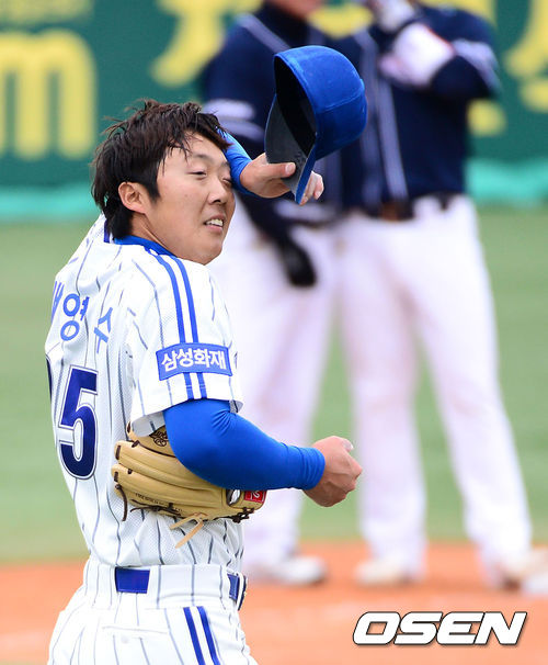 4회초 1사 1,2루 삼성 배영수가 폭투를 던지고 땀을 닦고 있다.