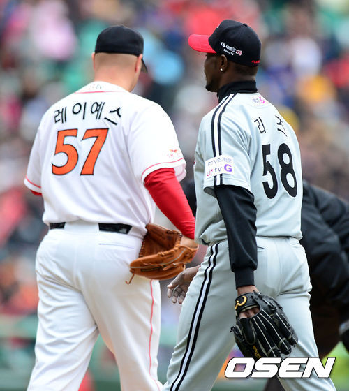 한국생활 3년차를 맞이하는 리즈와 SK가 큰 기대를 걸고 있는 새 외국인 투수 레이예스는 30일 문학구장에서 개막전 선발로 등판해 맞대결을 펼쳤다. 두 선수 모두 좋은 성과를 냈다. 레이예스는 7이닝 4실점(3자책), 리즈는 5⅓이닝 2실점으로 자기 몫을 했다. 중압감이 큰 개막전 선발임을 고려하면 좋은 피칭이었다. 레이예스의 경우는 불펜의 난조로 자책점이 불어난 불운도 있었다.