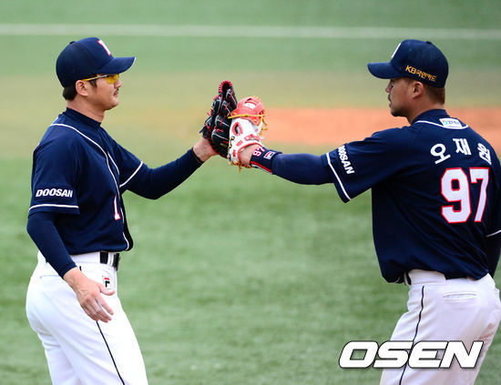 경기 종료 후 두산 이재우와 오재원이 승리의 기쁨을 나누고 있다. /sunday@osen.co.kr
