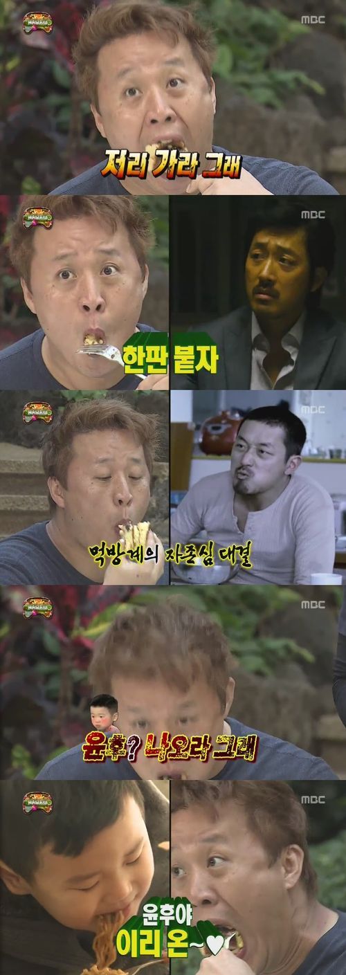 정준하는 "하정우? 저리 가라 그래"라며 "윤후? 다 나오라 그래"라고 자신만만한 모습으로 팬케이크를 먹었다.
