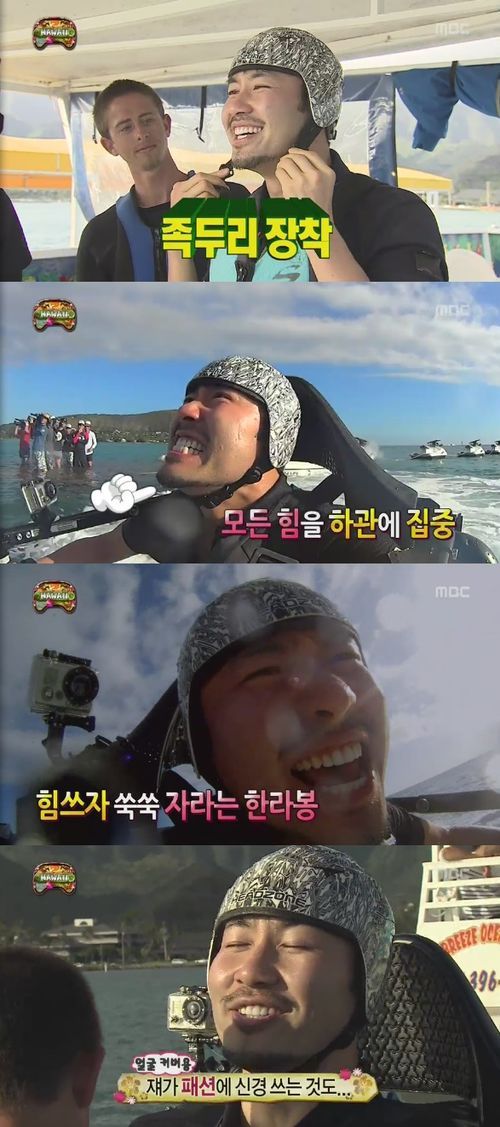 이어 제트 팩 플라이어를 탄 노홍철이 물 위에 떠오르려고 애쓰면서 하관에 힘을 주자 멤버들은 웃음을 참지 못했다.
