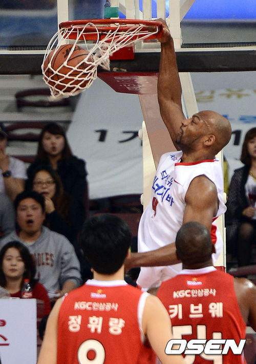 30일 오후 안양 실내체육관에서 열린 'KB 국민카드 2012-2013 프로농구' 6강 플레이오프 5차전 안양 KGC와 고양 오리온스의 경기 2쿼터 오리온스 윌리엄스가 덩크를 하고 있다.
