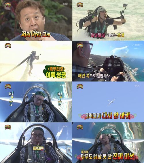 글라이더를 줄에 묶어 이륙해 해변까지 날아간 경비행기는 갑자기 글라이더와 연결된 줄을 끊었다. 이에 박명수는 당황해 하면서 어쩔 줄 몰라했다. 이때 기장이 박명수에게 지폐를 건네줬고 박명수는 지폐를 세기 시작했다.