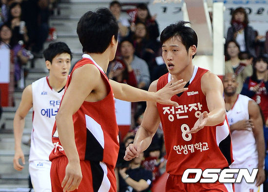30일 오후 안양 실내체육관에서 열린 'KB 국민카드 2012-2013 프로농구' 6강 플레이오프 5차전 안양 KGC와 고양 오리온스의 경기 3쿼터 KGC 최현민이 득점을 올린 뒤 패스를 해준 김태술과 하이파이브를 하고 있다.