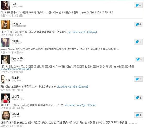 브라운아이드걸스의 제아는 "나의 니콜라스. 역시 기대를 저버리지 않았어. 꺅. '웜바디스' 너무 재밌어요. 화이트데이 때 여자 셋이 봤답니다. 홍홍"이라는 글과 함께 '웜바디스' 포스터 속 니콜라스 홀트에게 뽀뽀를 하는 모습으로, 개그우먼 박나래는 "어제 장거인과 '웜바디스'라는 영화를 봤다. 그리고 우리 둘은 생각했다. '좀비도 사랑을 하는데 멀쩡한 인간 둘은 왜'"라는 글을 올려 웃음을 자아냈다.