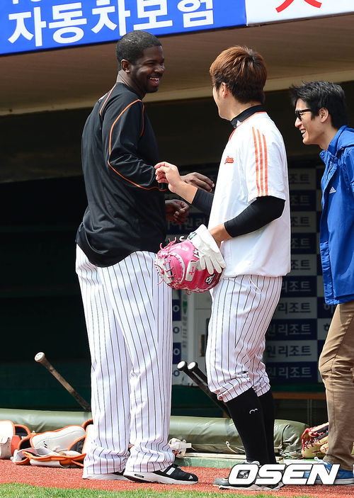 31일 오후 부산 사직구장에서 열리는 '2013 한국야쿠르트 세븐 프로야구' 롯데 자이언츠와 한화 이글스의 경기 시작 전 유먼과 강민호가 장난을치며 미소 짓고 있다.