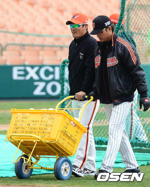 31일 오후 부산 사직구장에서 열리는 '2013 한국야쿠르트 세븐 프로야구' 롯데 자이언츠와 한화 이글스의 경기 시작 전 이종범 코치와 공필성 코치가 볼을 나르고 있다.