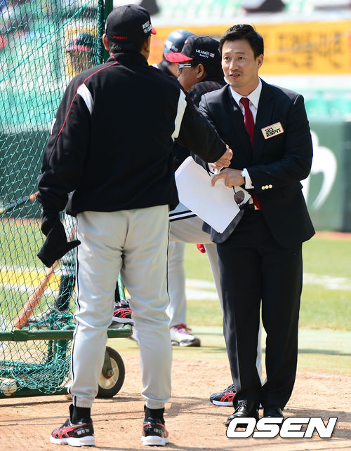 31일 오후 인천 문학구장에서 열리는 '2013 한국야쿠르트 세븐프로야구' SK 와이번스와 LG 트윈스의 경기를 앞두고 LG 김기태 감독과 김재현 SBS ESPN 해설이 인사를 나누고 있다.