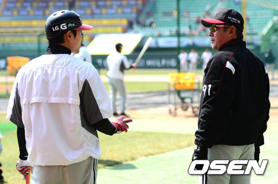 31일 오후 인천 문학구장에서 열리는 '2013 한국야쿠르트 세븐프로야구' SK 와이번스와 LG 트윈스의 경기를 앞두고 LG 김기태 감독과 정성훈이 대화를 나누고 있다.