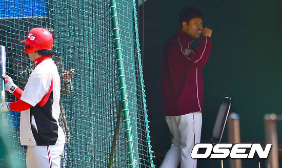 31일 오후 광주 무등구장에서 열리는 '2013 한국야쿠르트 세븐 프로야구' KIA 타이거즈와 넥센 히어로즈의 경기, 경기에 앞서 넥센 선발투수 김병현이 이를 닦으며 KIA 선수들의 타격을 바라보고 있다