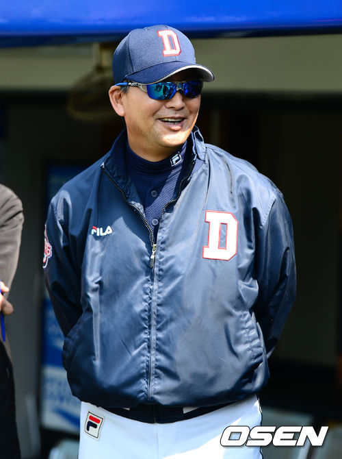 경기에 앞서 두산 김진욱 감독이 취재진과 이야기를 나누고 있다.