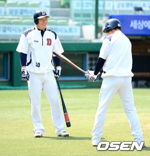 경기에 앞서 두산 김현수가 타격 훈련 중 환하게 웃고 있다.