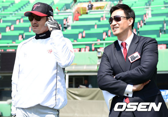 31일 오후 인천 문학구장에서 열리는 '2013 한국야쿠르트 세븐프로야구' SK 와이번스와 LG 트윈스의 경기를 앞두고 LG 서용빈 코치와 대화를 나누고 있다.