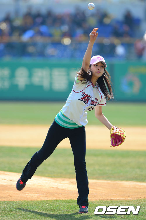 31일 오후 광주 무등구장에서 열린 '2013 한국야쿠르트 세븐 프로야구' KIA 타이거즈와 넥센 히어로즈의 경기, 경기에 앞서 미스코리아 진 김유미가 시구를 하고 있다