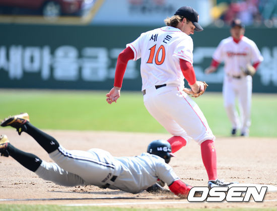 31일 오후 인천 문학구장에서 '2013 한국야쿠르트 세븐프로야구' SK 와이번스와 LG 트윈스의 경기가 열렸다. 1회초 LG 공격 SK 선발 세든이 1번 오지환의 내야땅볼 타구를 토스 받아 포스아웃 시키고 있다.