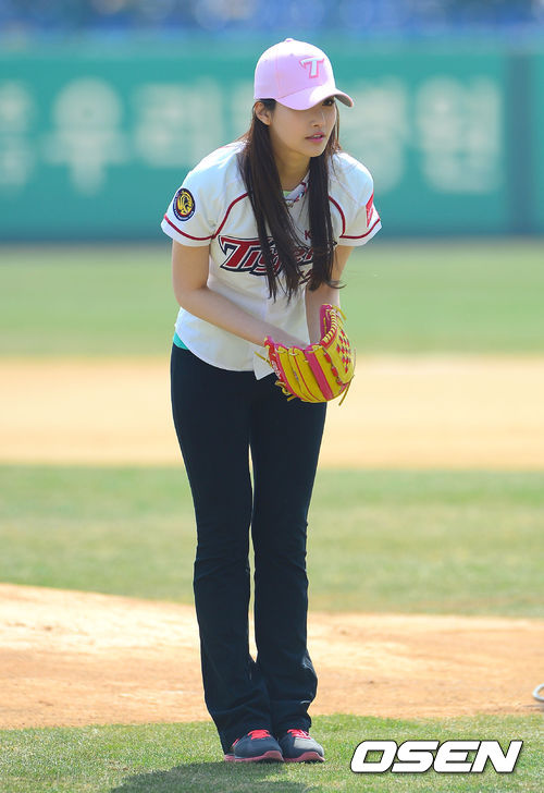 31일 오후 광주 무등구장에서 열린 '2013 한국야쿠르트 세븐 프로야구' KIA 타이거즈와 넥센 히어로즈의 경기, 경기에 앞서 미스코리아 진 김유미가 시구를 하고 있다
