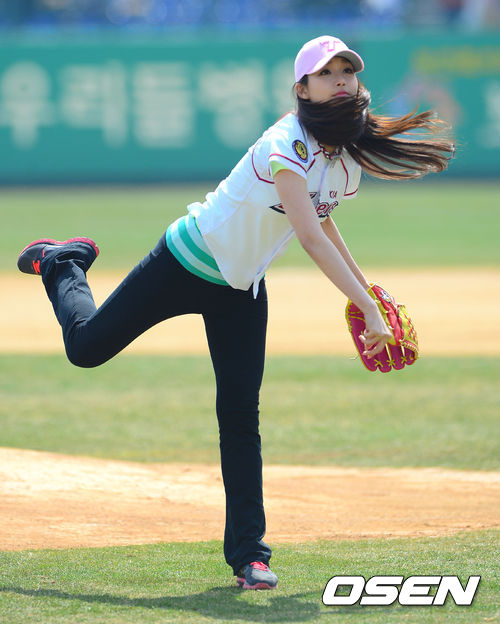 31일 오후 광주 무등구장에서 열린 '2013 한국야쿠르트 세븐 프로야구' KIA 타이거즈와 넥센 히어로즈의 경기, 경기에 앞서 미스코리아 진 김유미가 시구를 하고 있다
