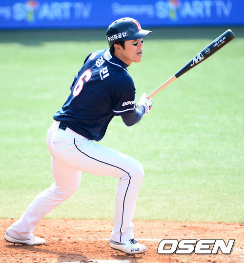2회초 1사 3루에서 두산 허경민이 희생플라이를 치고 있다.