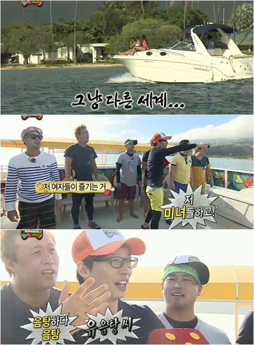 이에 정준하 역시 "저 여자들이 즐기는게 하와이"라고 동조하자 유재석은 "저게 하와이다. 미녀들하고 저렇게"라고 흑심을 드러냈다.