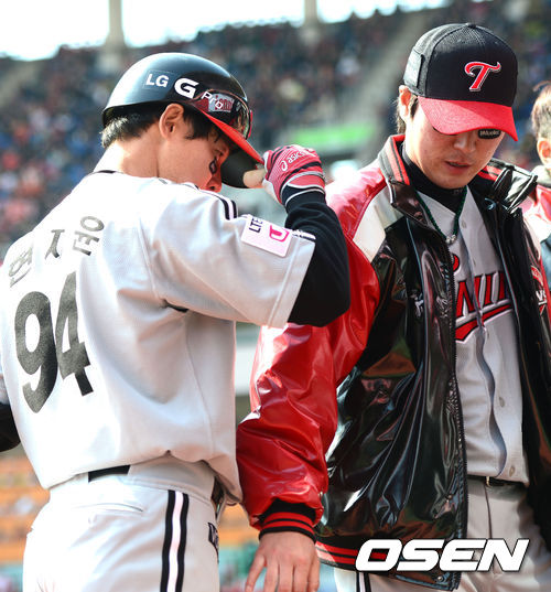 31일 오후 인천 문학구장에서 '2013 한국야쿠르트 세븐프로야구' SK 와이번스와 LG 트윈스의 경기가 열렸다. 2회초 LG 공격 2사 주자 없는 상황 8번 현재윤이 솔로포를 날리고 LG 선발 우규민과 인사를 나누고 있다.