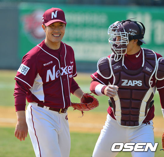 31일 오후 광주 무등구장에서 열린 '2013 한국야쿠르트 세븐 프로야구' KIA 타이거즈와 넥센 히어로즈의 경기,3회말 이닝 종료 후 넥센 선발투수 김병현이 미소 지으며 더그아웃으로 들어가고 있다