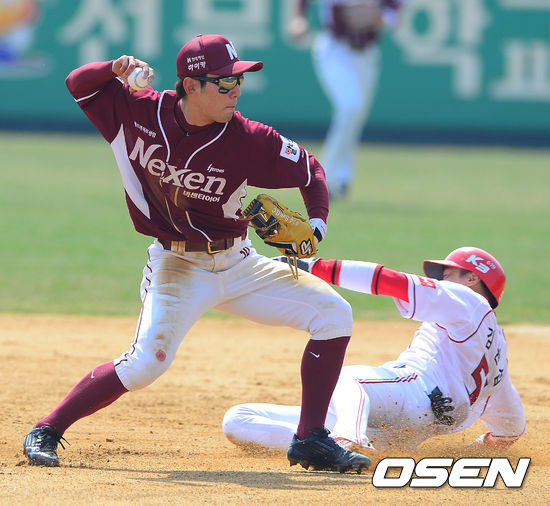 31일 오후 광주 무등구장에서 열린 '2013 한국야쿠르트 세븐 프로야구' KIA 타이거즈와 넥센 히어로즈의 경기,1회말 1사 1루 KIA 이범호의 내야땅볼때 넥센 서건창 2루수가 1루자 김원섭을 포스아웃 시킨후 병살시도하고 있다