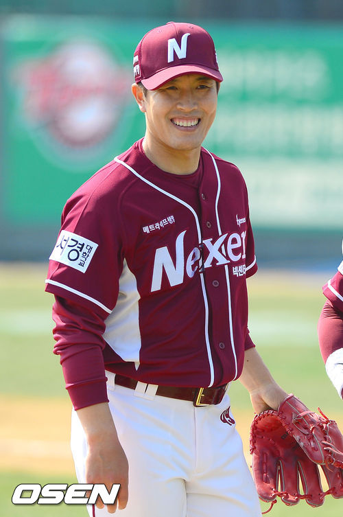 31일 오후 광주 무등구장에서 열린 '2013 한국야쿠르트 세븐 프로야구' KIA 타이거즈와 넥센 히어로즈의 경기,3회말 이닝 종료 후 넥센 선발투수 김병현이 미소 지으며 더그아웃으로 들어가고 있다