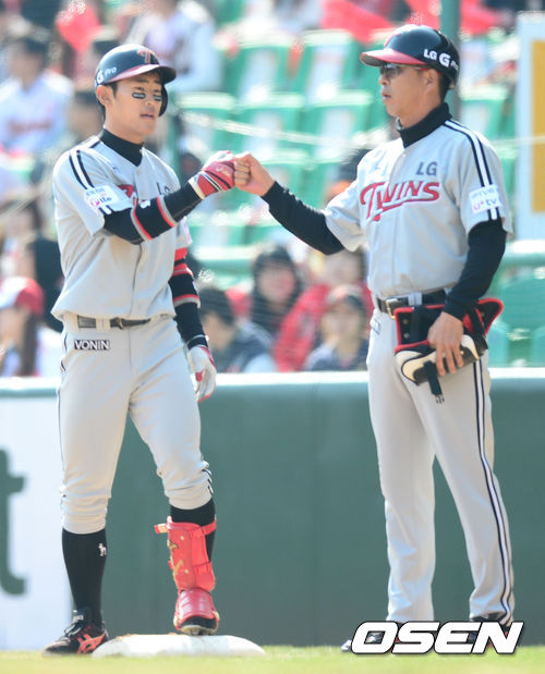 31일 오후 인천 문학구장에서 '2013 한국야쿠르트 세븐프로야구' SK 와이번스와 LG 트윈스의 경기가 열렸다. 4회초 LG 공격 1사 1, 3루 상황 9번 정주현이 1타점 적시타를 날리고 김인호 1루 코치와 인사를 나누고 있다.