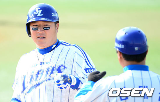 3회말 2사 2루에서 삼성 최형우가 중전 적시타를 치고 김태균 코치와 하이파이브를 하고 있다.