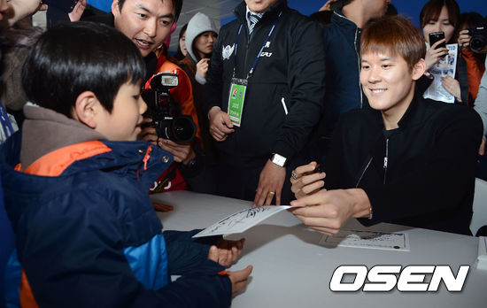 31일 오후 인천축구전용경기장에서 열린 '현대오일뱅크 K리그 클래식 2013' 4라운드 인천 유나이티드와 대전 시티즌의 경기에 앞서 인천시청 소속 박태환의 팬사인회가 열렸다.