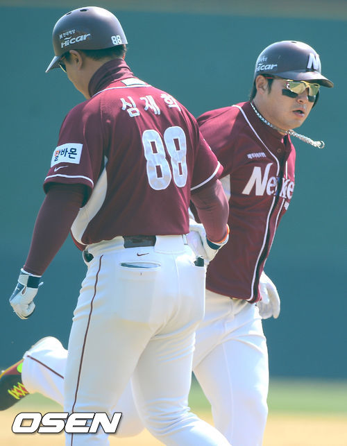 31일 오후 광주 무등구장에서 열린 '2013 한국야쿠르트 세븐 프로야구' KIA 타이거즈와 넥센 히어로즈의 경기,1회초 2사 넥센 박병호가 솔로홈런을 날린 후 심재학 코치와 하이파이브를 하고 있다