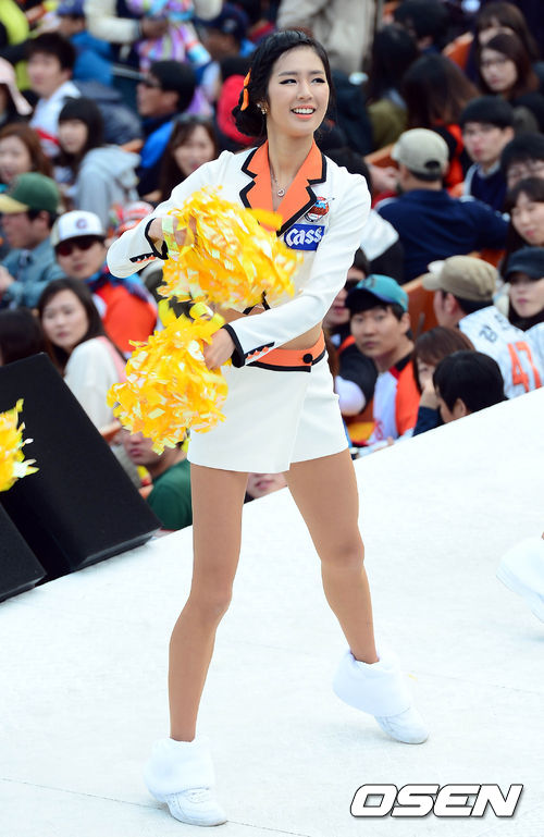 31일 오후 부산 사직구장에서 열린 '2013 한국야쿠르트 세븐 프로야구' 롯데 자이언츠와 한화 이글스의 경기, 치어리더 박기량이 응원을 펼치고 있다.