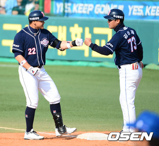 5회초 1사 1,2루에서 두산 홍성흔이 중전 적시타를 치고 김민재 코치와 하이파이브를 하고 있다.