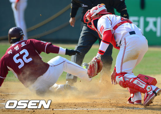 31일 오후 광주 무등구장에서 열린 '2013 한국야쿠르트 세븐 프로야구' KIA 타이거즈와 넥센 히어로즈의 경기,6회초 1사 1,2루 넥센 유한준의 1타점 적시타때 2루 주자 박병호가 홈쇄도하고 있다