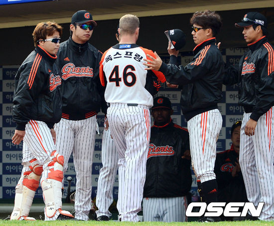 31일 오후 부산 사직구장에서 열린 '2013 한국야쿠르트 세븐 프로야구' 롯데 자이언츠와 한화 이글스의 경기 6회초 옥스프링이 마운드를 내려가면서 동료들의에게 격려를 받고 있다.