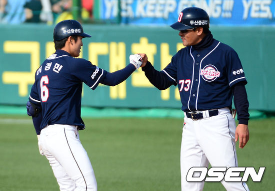 5회초 1사 만루에서 두산 허경민이 중전 적시타를 치고 김민재 코치와 하이파이브를 하고 있다.