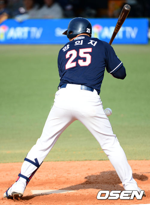 5회초 1사 만루에서 두산 양의지가 삼성 심창민의 투구를 맞고 있다.