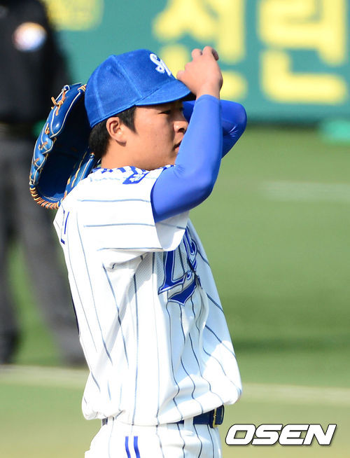 5회초 1사 만루에서 삼성 심창민이 두산 양의지에게 몸에 맞는 볼로 출루를 허용하며 아쉬워하고 있다.
