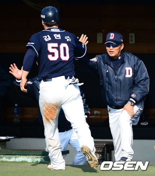5회초 1사 만루에서 두산 허경민의 중전 적시타 때 홈을 밟은 3루주자 김현수가 덕아웃에서 김진욱 감독의 축하를 받고 있다.