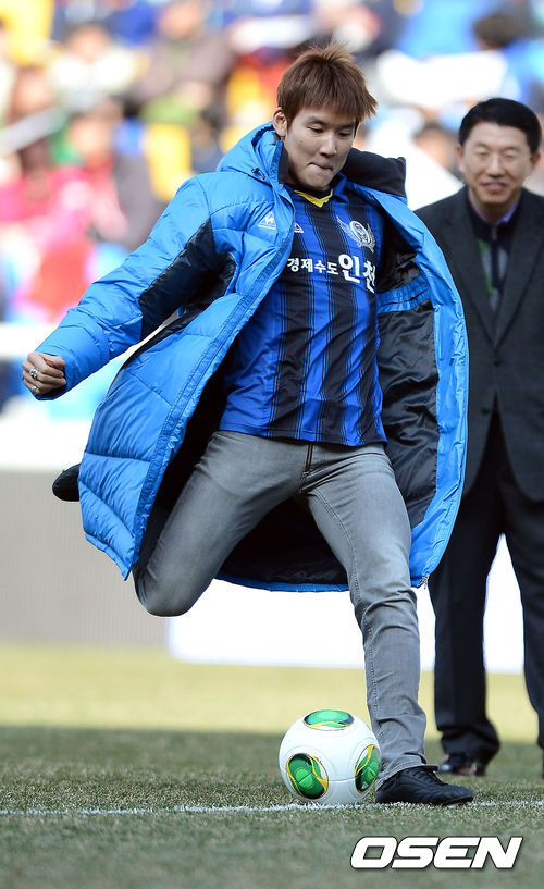 31일 오후 인천축구전용경기장에서 열린 '현대오일뱅크 K리그 클래식 2013' 4라운드 인천 유나이티드와 대전 시티즌의 경기에 앞서 박태환이 시축을 하고 있다.