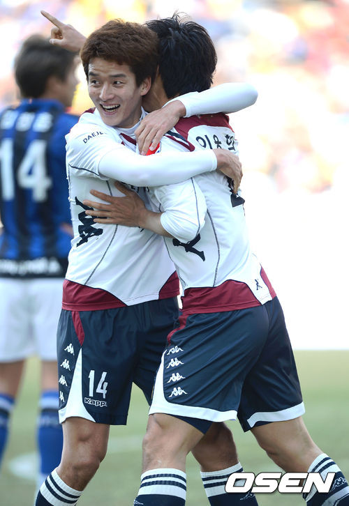 31일 오후 인천축구전용경기장에서 열린 '현대오일뱅크 K리그 클래식 2013' 4라운드 인천 유나이티드와 대전 시티즌의 경기 전반 대전 김태연이 선취골을 넣은 이웅희와 포옹을 하고 있다.