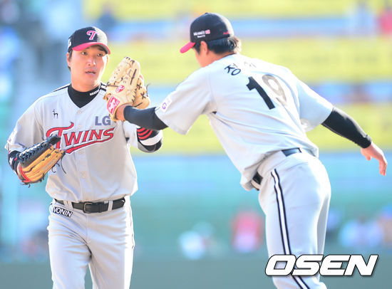 31일 오후 인천 문학구장에서 '2013 한국야쿠르트 세븐프로야구' SK 와이번스와 LG 트윈스의 경기가 열렸다. 8회말 SK 공격 2사 1루 상황 LG 우익수 이진영이 4번 최정의 우중간 깊은 타구를 멋지게 잡아 이닝을 마무리 지은 뒤 투수 정현욱과 인사를 나누고 있다.