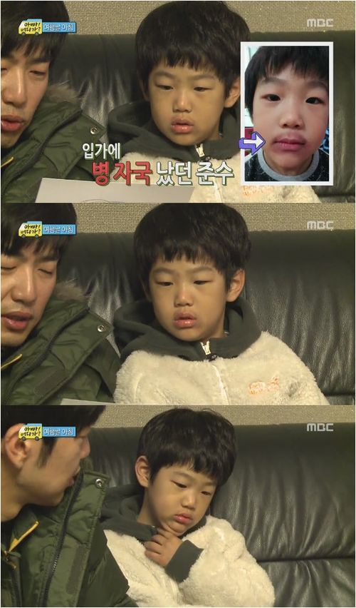 이준수는 31일 방송된 MBC 예능프로그램 ‘일밤-아빠 어디가’에서 입 주변에 병 자국이 선명한 모습을 보였다. 송지아 역시 지난 방송에서 입 주변이 검게 일어나 걱정을 샀다.