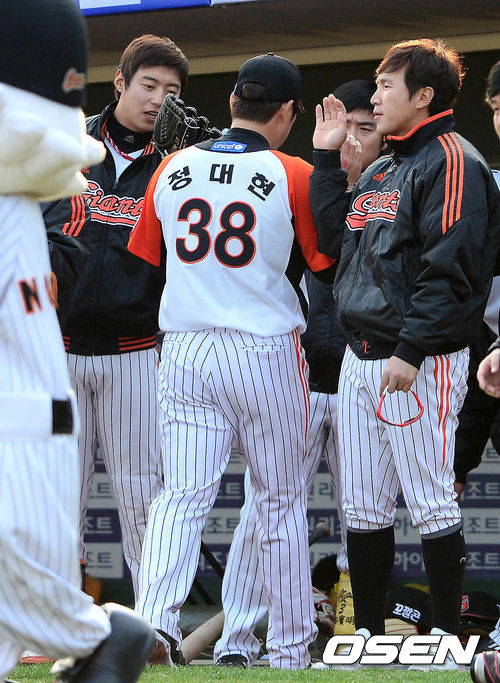 31일 오후 부산 사직구장에서 열린 '2013 한국야쿠르트 세븐 프로야구' 롯데 자이언츠와 한화 이글스의 경기 8회초 2사 만루 대타 이양기를 삼진으로 처리한 정대현이 덕아웃으로 향하며 동료들의 격려를 받고 있다.