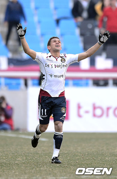 31일 오후 인천축구전용경기장에서 열린 '현대오일뱅크 K리그 클래식 2013' 4라운드 인천 유나이티드와 대전 시티즌의 경기 후반 대전 주앙파울로가 추가골을 넣고 기뻐하고 있다.
