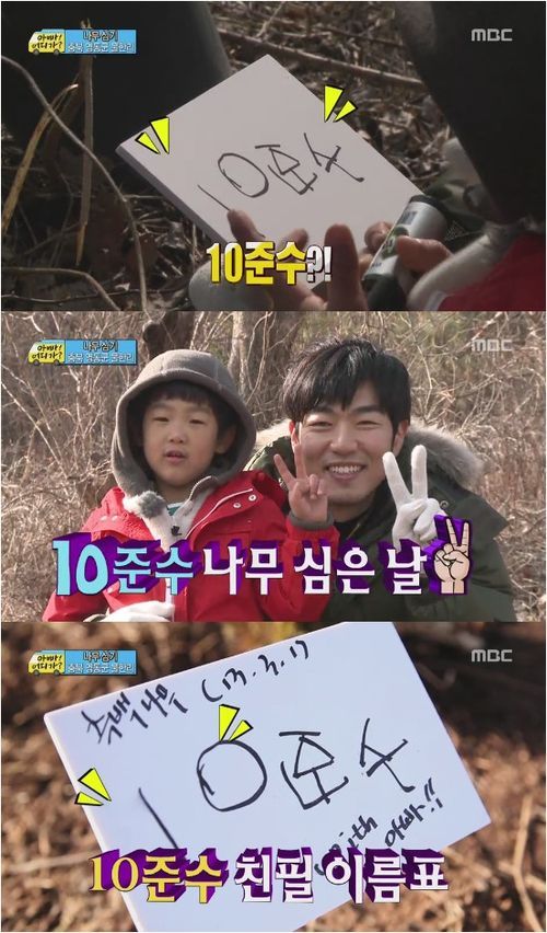 이준수는 31일 방송된 MBC 예능프로그램 ‘일밤-아빠 어디가’에서 아빠 이종혁과 나무를 심은 후 나무 옆에 이름을 적었다. 한창 한글을 배우고 있는 이준수는 엉망인 순서로 글씨를 써내려갔다.