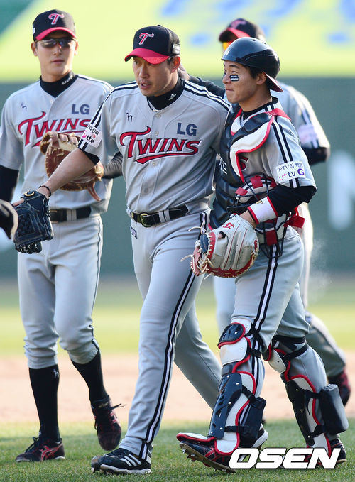 경기를 마무리지은 LG 마무리투수 봉중근과 포수 현재윤이 인사를 나누고 있다.